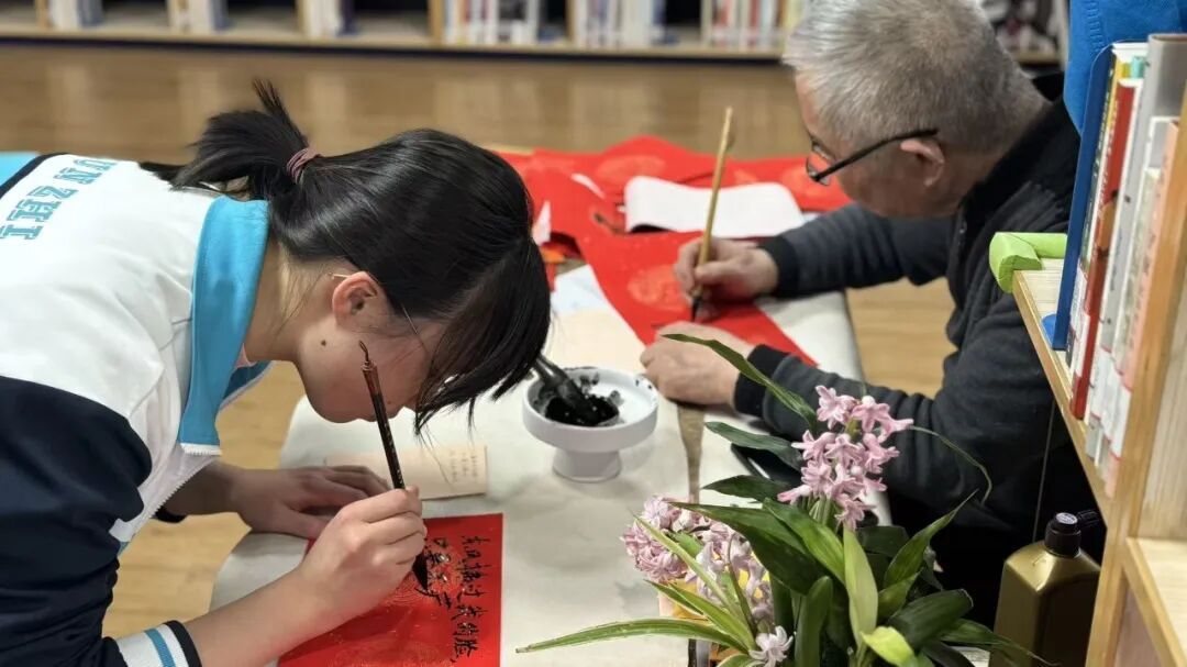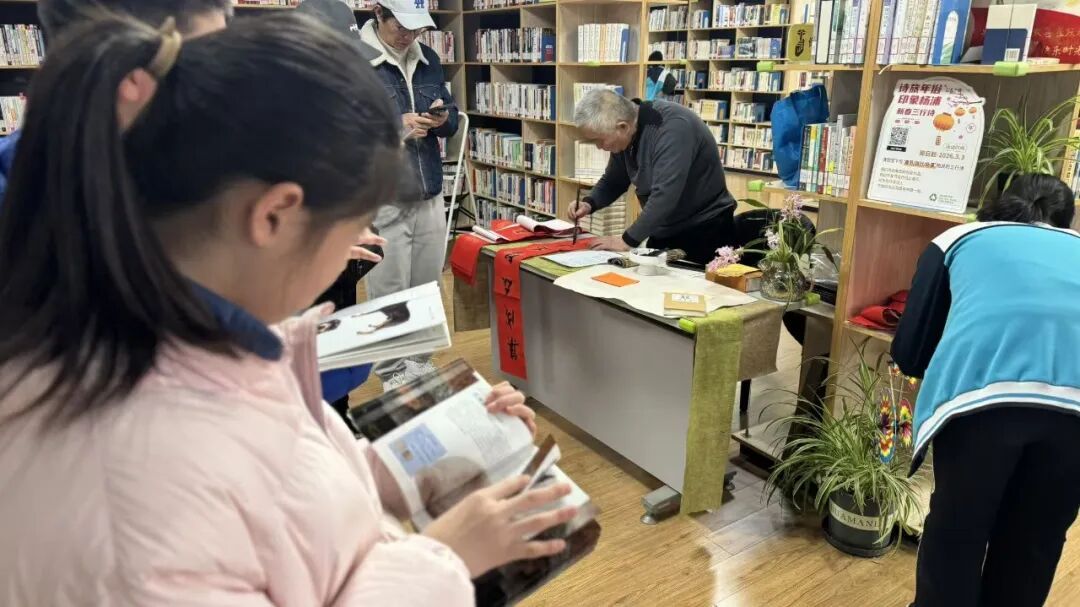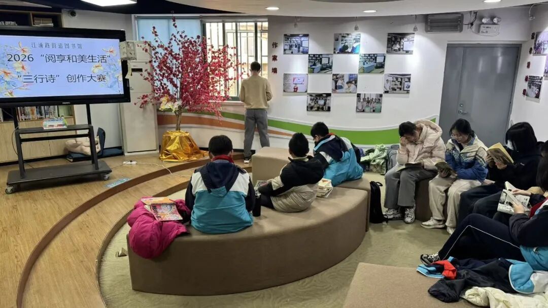 5楼的图书馆内,年味与书香交织,别有一番趣味。由杨浦区图书馆组织的“三行诗”创作大赛火热进行,辖区青少年围绕“我在图书馆的日子”,尽情书写独属于自己的图书馆故事。孩子们围在社区书画院吴云亭老师身旁,一边展示原创三行诗,一边探讨书写字体。吴老师还为孩子们讲解春节贴春联的传统习俗,从贴联讲究到春联寓意,让孩子们在笔墨交流中领略传统文化魅力,把新春的美好期许藏进一撇一捺里。
