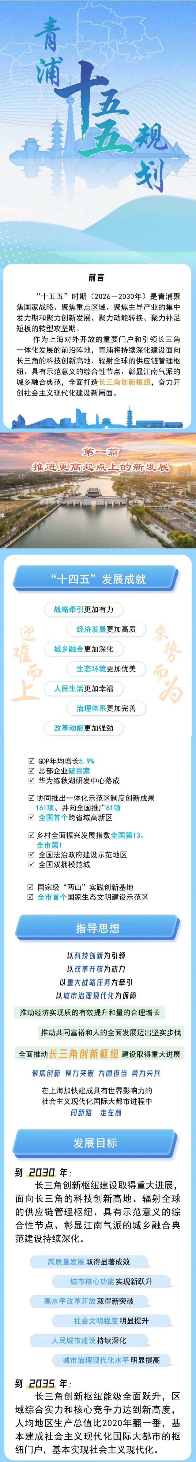 本期介绍的是青浦区。《青浦区国民经济和社会发展第十五个五年规划纲要》已经区六届人大六次会议审查批准。“十五五”时期,青浦将全面打造长三角创新枢纽,奋力开创社会主义现代化建设新局面。未来五年的青浦会是什么样?