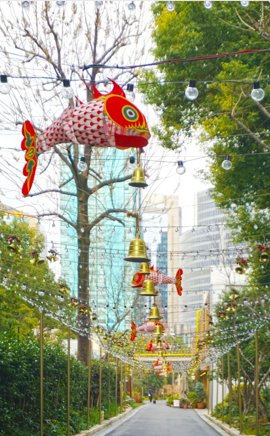 白天的永源路是潮流主场,到了晚上,这里就变成了温柔乡。树梢上挂着的鱼灯,红色的鳞片泛着柔光,像极了从老年画里直接游出来的锦鲤,把晚风都吹出了暖意。暖黄色的灯笼串联起整条街,光晕在檐角跳跃。
