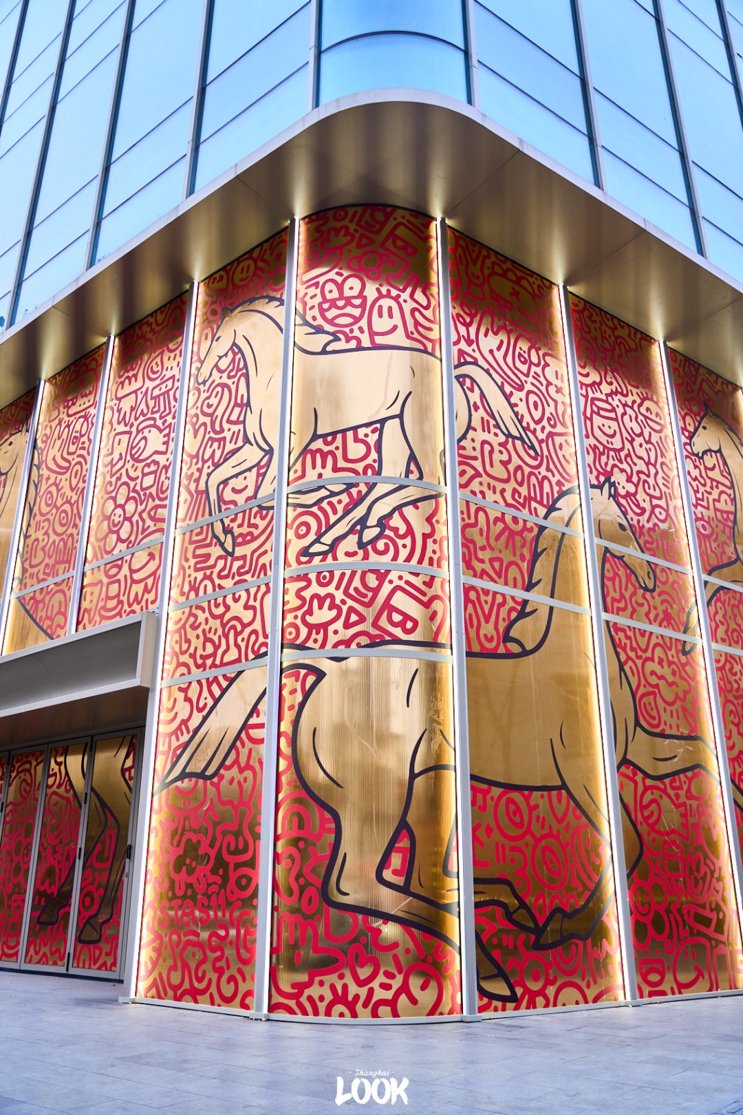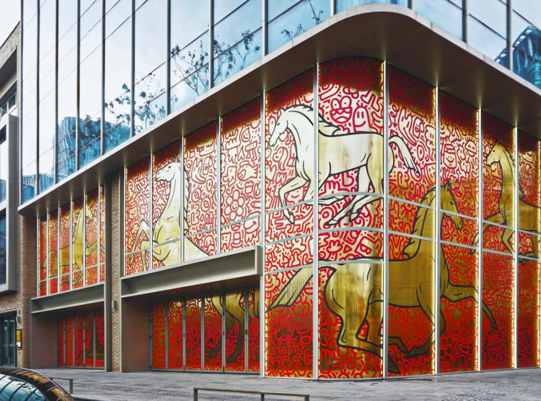 艺术家把对 “新生” 与 “潮流” 的理解,揉进了永源路的肌理里。永源路的建筑本身就是画布,于是他把 “马” 的意象放大,搬上了沿街的玻璃幕墙。金底红纹的巨马昂首跃起,涂鸦纹路与草地上的小马遥相呼应,像是一场跨空间的对话:草地上的小马是 “初生的热烈”,墙面上的巨马是 “成长的锋芒”。