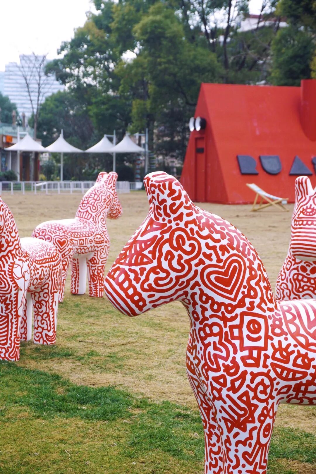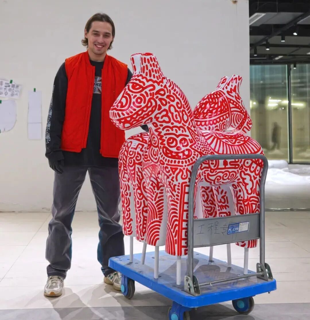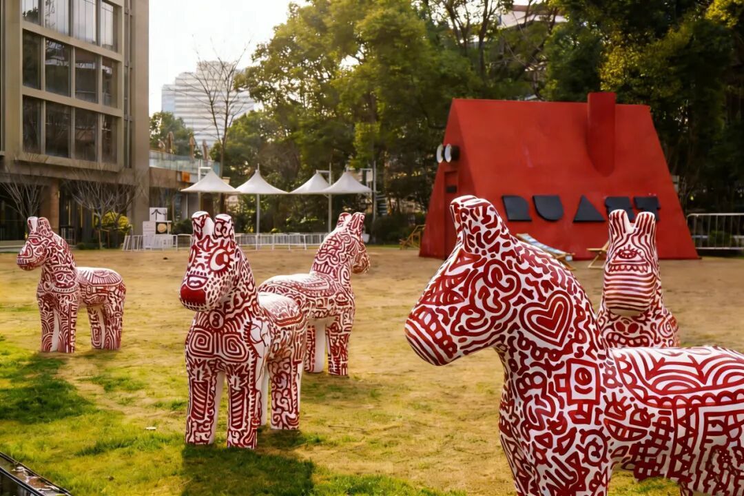 马年新春临近,俄罗斯艺术家Stas Khomich把他标志性的“红纹”涂鸦带到了永源路。他用一种很“野”的方式,把古典的东方意象和街头潮流玩出了火花。户外大草坪上,8匹红白涂鸦小马并肩而立。