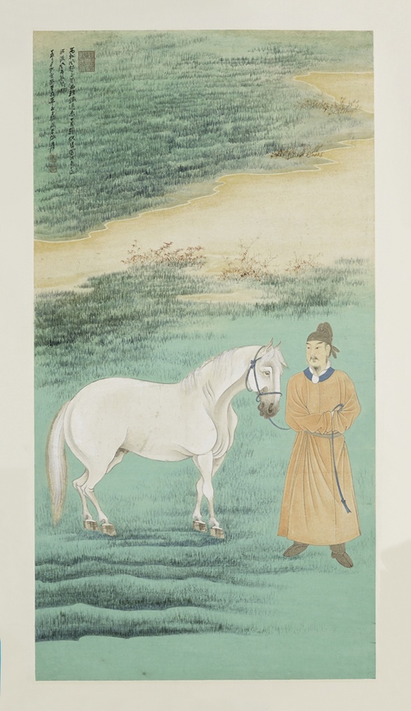 此图仿唐人工笔设色画法,画面左上方题写元诗大家虞集所作《曹将军马》,以驰想唐朝著名鞍马画家曹霸笔下的遗风余韵。