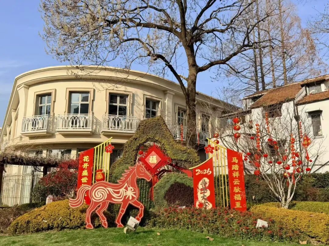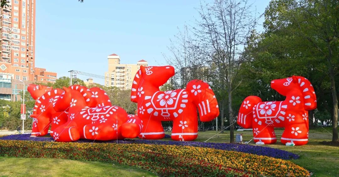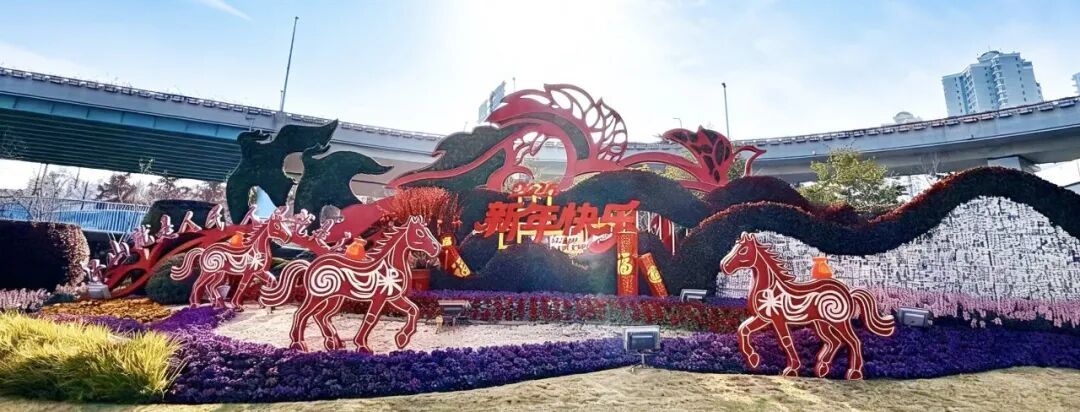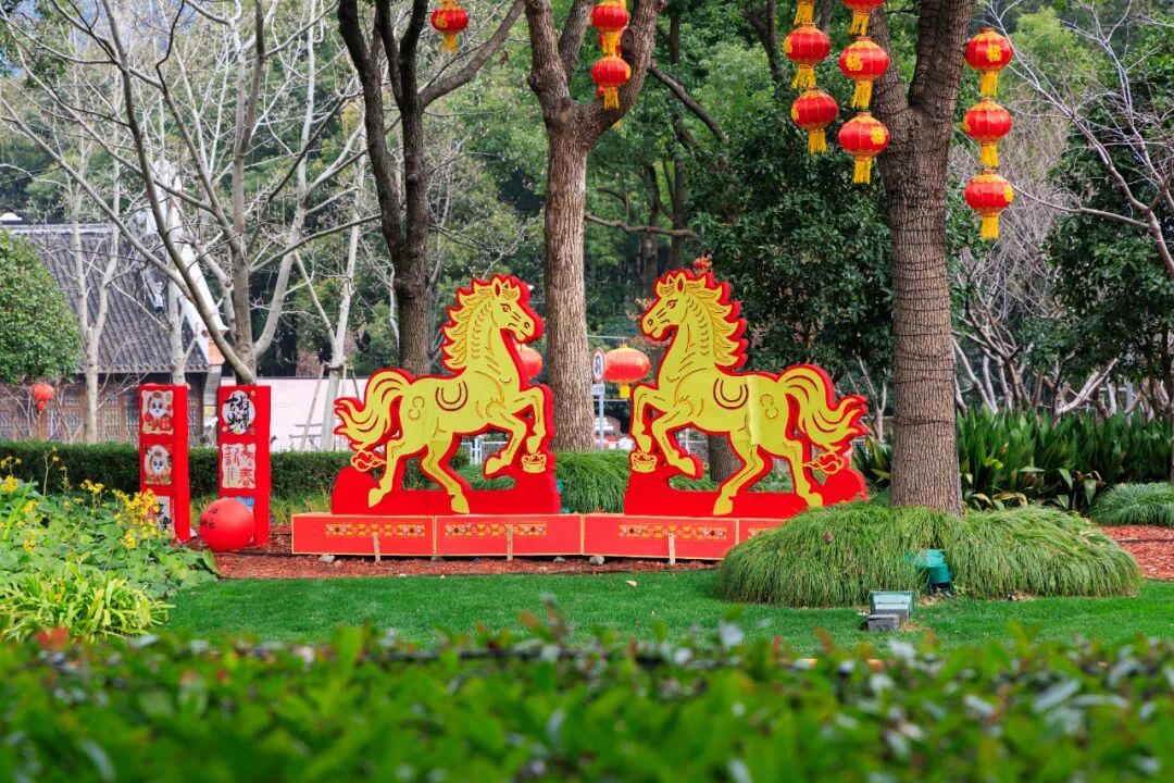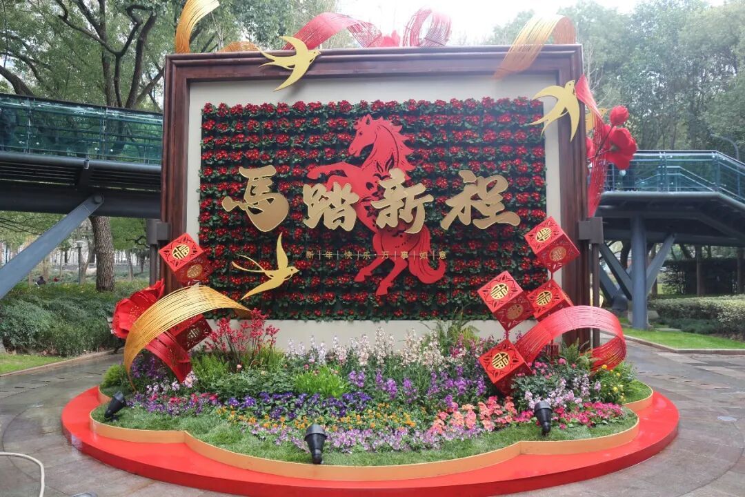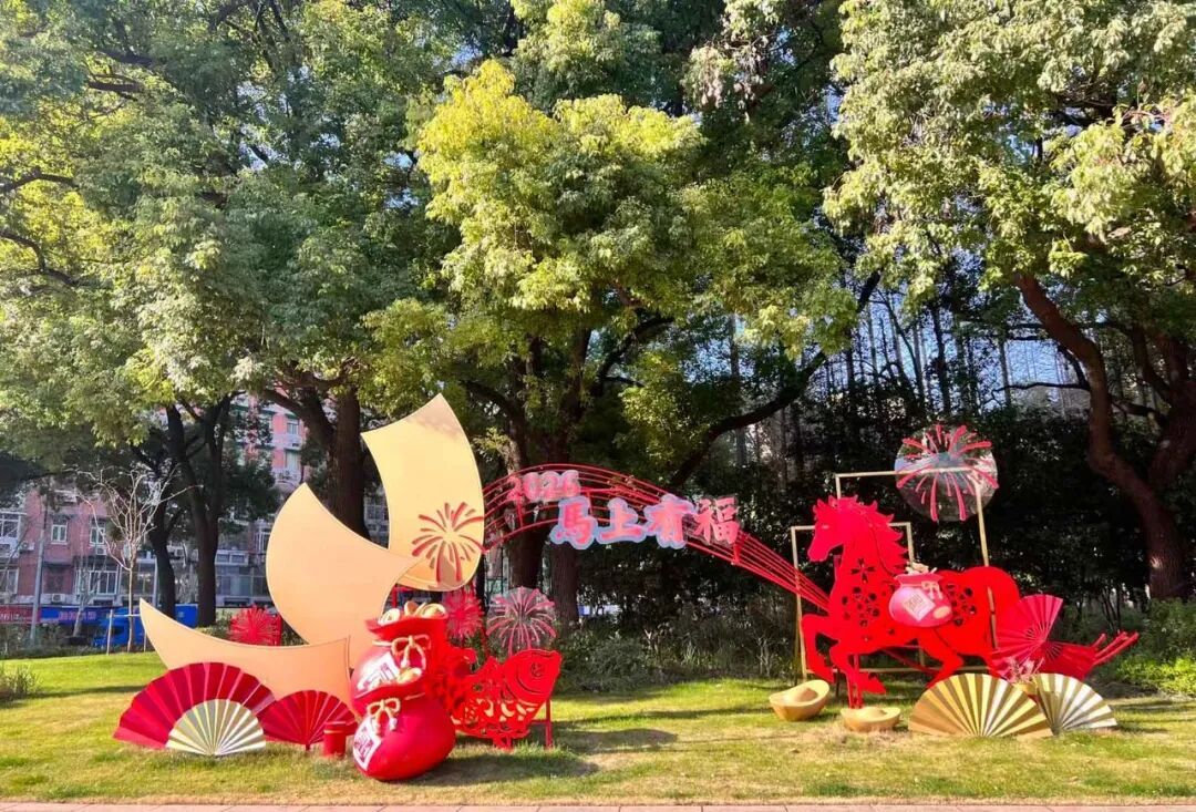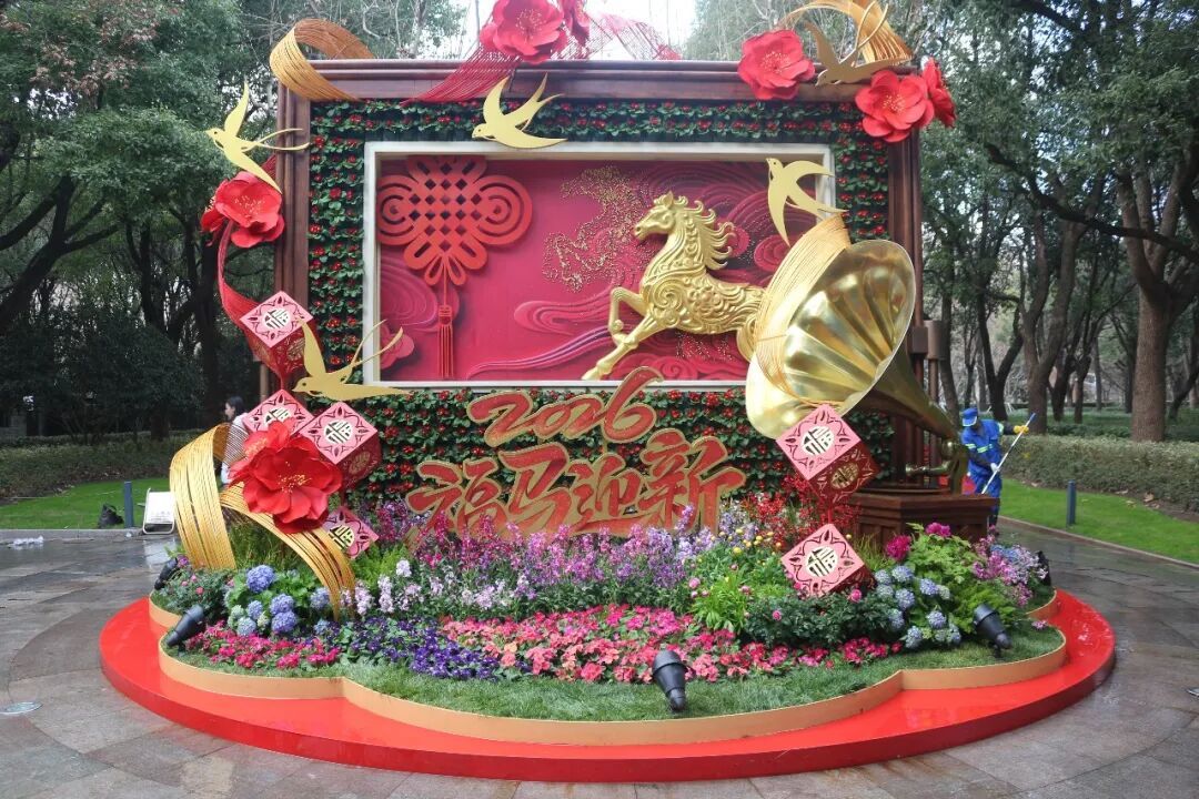 体现“马”年主题,除了布置中国结、红灯笼、福字、波浪彩带及蝴蝶结等传统元素,还通过各种“马”元素的装饰小品,凸显马年文化韵味。
