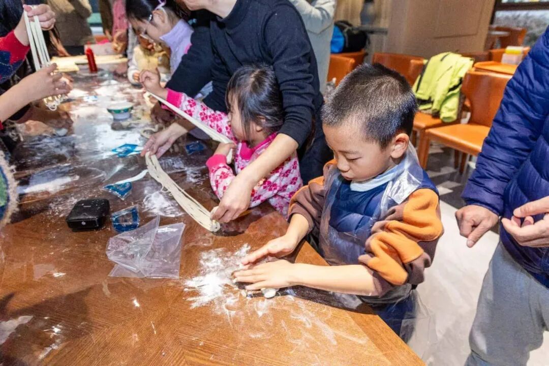 讲解过后,便是亲子齐上阵的体验时刻。围上小围裙,洗净双手,孩子们化身为跃跃欲试的“拉面小匠人”。一开始,面团在稚嫩的手中显得有些“倔强”,不是粗细不均,就是轻易断裂。在家长和店长的耐心指导下,孩子们逐渐掌握了巧劲:“要先轻轻抻长,感觉到它的韧性,再对折,像这样……”渐渐地,有模有样的面条在孩子们的手中成型。
