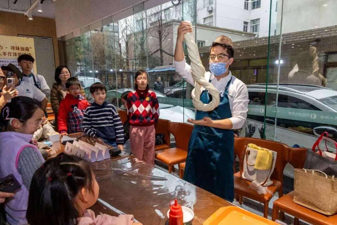 “哇,好厉害呀!”在孩子们的惊叹声中,阿西娅牛肉面店的马店长展示了他的拉面技艺。面团在他的手中仿佛被赋予了生命,对折、抻拉、回环,动作行云流水。短短几分钟,“毛细”如发,“二细”匀称,“韭叶”宽韧,八种不同形态的拉面依次呈现。“拉面不仅是手艺,还是咱们中华饮食里的一门‘哲学’,和而不同,各具其美。”马店长的讲解,将文化根脉悄然植入孩子们的认知。