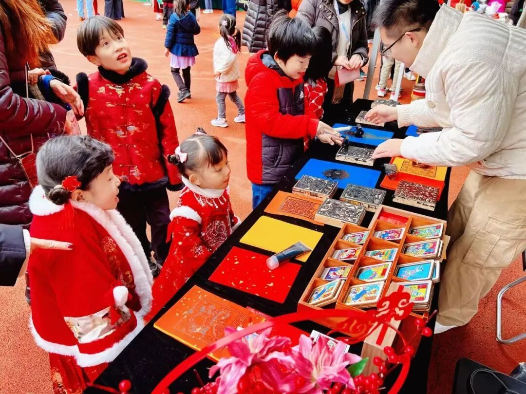 糖画摊位前,金黄的糖稀在老师的手腕翻转间,被制作成了马年吉祥纹样,跃然石板之上;木版年画拓印区更是热闹,孩子们握着滚轮认真操作,五彩的年画在纸面上慢慢成型;吸“福”字、绘祝福、“马上有福”等小游戏前,中外孩子们踊跃参与,相互协作,在趣味互动中拉近距离。