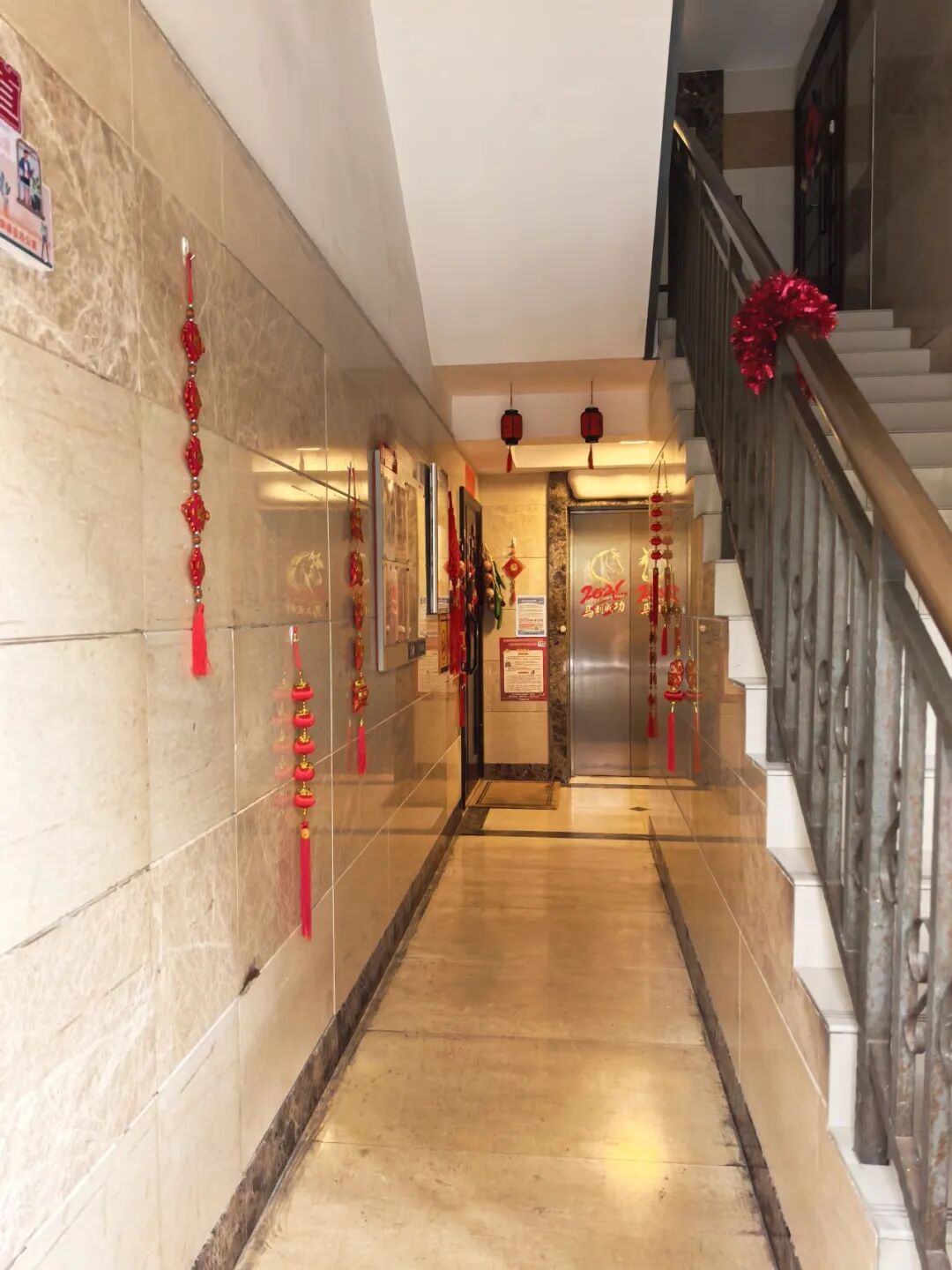 紫勋雅苑的楼栋大厅内,年味更显精巧雅致。红色细绳垂挂起串串艳红爆竹、玲珑灯笼与吉祥双鱼装饰,错落有致、氛围感拉满,默默传递着“福气满满”“平安喜乐”“年年有余”的美好祈愿。金灿灿的元宝摆件点缀其间,喜气洋洋的财神造像笑意盈盈,为社区带来喜庆华贵的色彩,每一处细节都藏着团圆的欢喜。