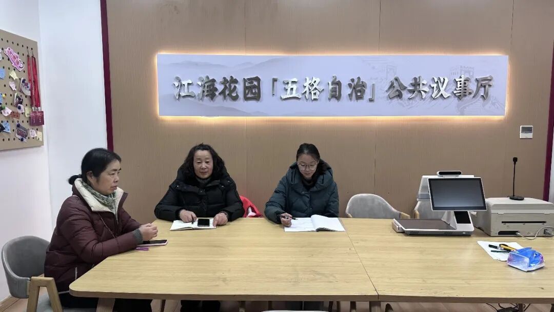 南桥镇江海花园业委会秘书(右一)协助开展业主接待日活动