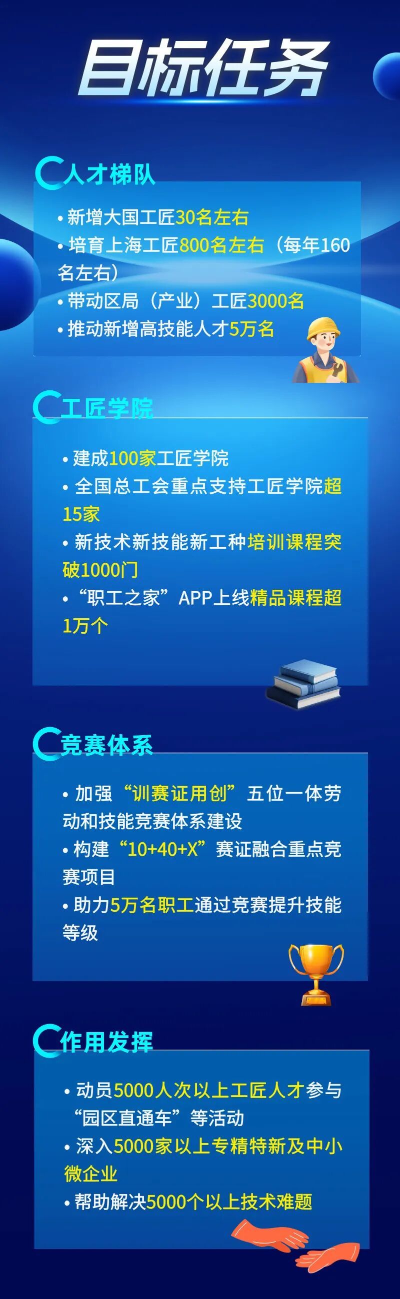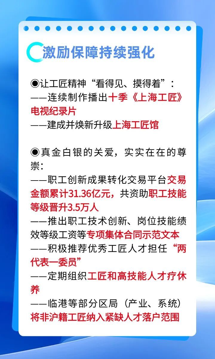 未来五年,上海将新增多少 大国工匠、多少上海工匠? 工匠和高技能人才成长通道 将怎样升级? 今天,上海市总工会重磅发布 《上海市工匠和高技能人才培育 体系建设“十五五”规划》 ——这是一份面向2030年的行动纲领, 更是一封写给全市职工技能成长成才的 “职业规划书”! 为深入贯彻落实《中共中央 国务院关于深化产业工人队伍建设改革的意见》核心任务,全面落实《上海市国民经济和社会发展第十五个五年规划纲要》“深化高水平人才高地建设”的战略部署,上海市总工会编制本规划。 Science Technology 01 突出系统选才 完善培育工作体系 ◉细化“工匠五力”评价标准(引领力、实践力、创新力、攻关力、传承力),让工匠成长有标尺。 ◉优化“区局工匠→上海工匠→大国工匠”进阶路径,培育期1年,每年认定1次。 ◉拓宽选育视野:大数据、人工智能、云计算人才;优秀青年、女性高技能人才;老字号传人、非公企业能手——只要你够格,这里就有舞台。 ◉竞赛直通:市级以上重点竞赛优胜者,可直接认定为上海工匠! 02 突出精准育才 建强主阵地主渠道 ◉“1+1+16+N”布局:1个上海工匠学院联盟、1家上海工匠学院、16个区的区级工匠学院、N个产业工匠学院——上海重点产业布局到哪里,学院就建到哪里。 ◉上海工匠学院联盟:整合全市资源,设立智能制造、高端装备、城市建设等专业委员会,打造技能培训“资源池”与“配送枢纽”。 ◉拓展办学视野:探索创新培训营、高级研修班、境外培训班——学习无边界,成长无时限 ◉赛证融合:对接10条重点产业链、14个区级主导产业集聚区,每年实施“10+40+X”竞赛项目,竞赛成绩与技能等级认证、薪酬激励、成果转化全链条打通! 03 突出实践成才 拓展作用发挥路径 ◉“劳模工匠助企行”再深化:跨区域、跨行业、跨企业组建服务队,平台数智化、供需精准化。 ◉工匠当老师:鼓励工匠担任工匠学院、职工学堂兼职教师,从“解题者”升级为“授渔人”。 ◉创新工作室“传帮带”:支持申报全国及上海市劳模工匠创新工作室,让青年职工在实战中“出师”。 ◉链主企业领航:推动产业链上下游共建人才培养生态圈,复合型高技能人才“组团出道”。 04 突出激励人才 营造良好环境生态 ◉政治关怀:推荐工匠担任“两代表一委员”、工会兼职副主席,优先推荐五一劳动奖章、劳动模范。 ◉创新服务:建立专家咨询库,为“卡脖子”技术攻关提供全程辅导,推荐申报国家及上海科技进步奖、中国专利奖。 ◉薪酬激励:推行“新八级工”制度,特级技师、首席技师优先评聘大国工匠、上海工匠;年薪制、协议工资、股权激励——让技能真正“值钱”。 ◉人才礼遇:“工匠礼遇政策包” 来啦!积分落户、人才公寓、子女教育、医疗健康、疗休养……归集最优政策,让工匠有面子、有里子、有奔头。 ◉宣传矩阵:每年选树10名上海工匠典型,拍摄《上海工匠》纪录片,升级工匠馆——让工匠故事刷屏,让工匠精神出圈。 Science Technology 01 人才共育 市总工会牵头,市产改协调小组成员单位联动,每年评估、中期盘点、终期交账。 02 企业主责 国企示范、民企创新,工匠培育成效纳入企业社会责任报告,优秀企业优先推荐荣誉评选。 03 数字赋能 建设全市工匠人才数据库,“一人一策”个性化培育方案,选育管用全流程数智化。 04 经费保障 工会设立工匠和高技能人才培育专项经费,撬动企业和社会投入,确保每一分钱都花在人才成长刀刃上。 奋力绘新篇,奋进正当时! 未来五年,上海工会将以 更大力度、更实举措、更暖服务, 让更多工匠人才破土而出、拔节生长, 在加快建设现代化产业体系、 培育新质生产力的征程中, 以技能报国,以匠心铸梦! 每一位工匠和高技能人才, 都值得被看见; 每一位由“工”到“匠”奋斗路上追梦者, 终将迎来高光时刻! 上海工匠人才,未来可期!