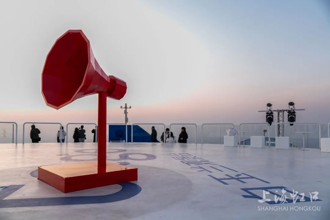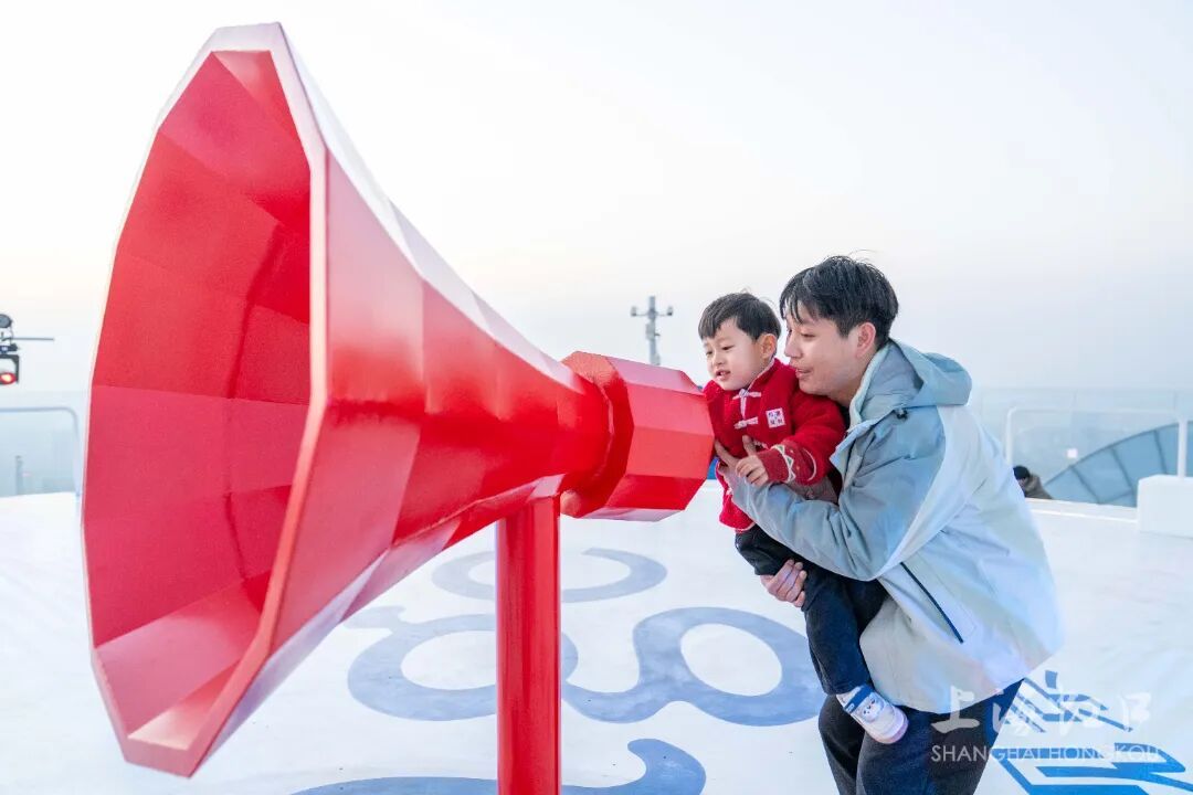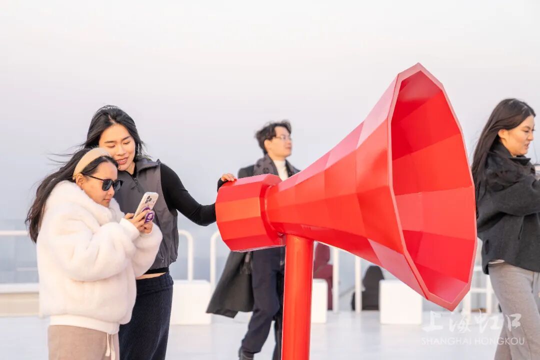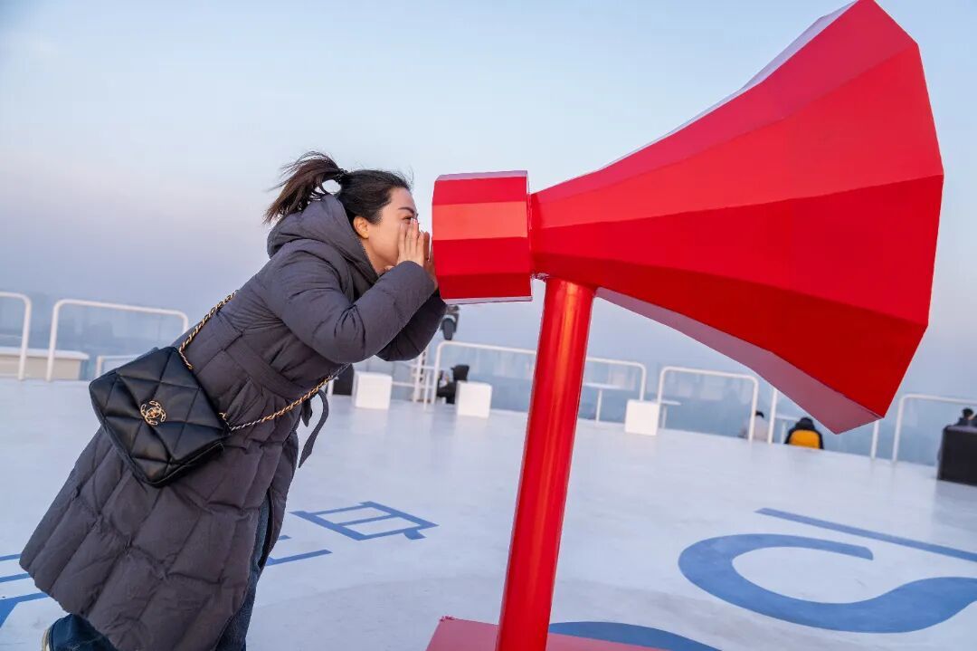 现场,观景台核心区域已搭建起一座高1.8米的喇叭造型红色声波装置,醒目亮眼,与新春喜庆氛围完美契合。工作人员介绍,这座“大喇叭”声波装置承载着“愿力成真”的美好寓意,游客的每一句心愿,都将化作“城市的回响”,陪伴大家开启一整年的好声量、好运气。