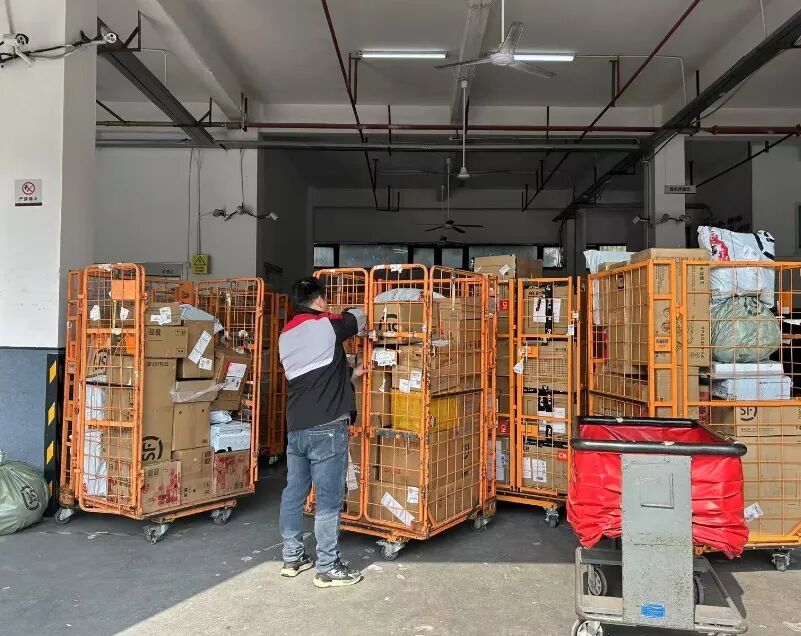 2月11日下午2时,位于广富林路的顺丰快递网点内热火朝天。一辆辆货运车辆有序进场卸货、装货,快递员们忙着分拣、扫码、打包,再根据包裹去向精准投放入笼车之中,操作熟练高效。