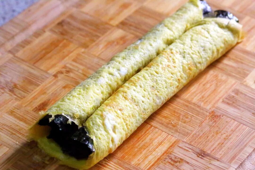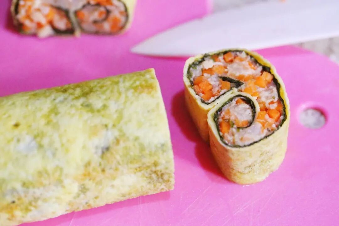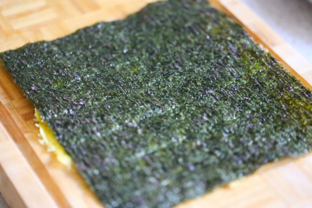 3.将蛋皮平铺在案板上,在上面铺一张寿司海苔,再将馅料均匀涂抹在上面。