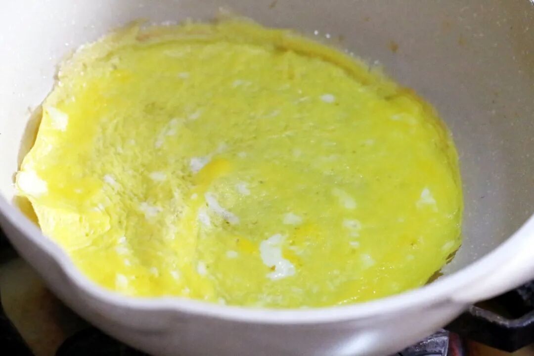 2.将鸡蛋敲入碗中,打散,加入盐和鲜奶搅拌均匀做成蛋液,放入平底煎锅中煎成薄蛋皮,取出备用。