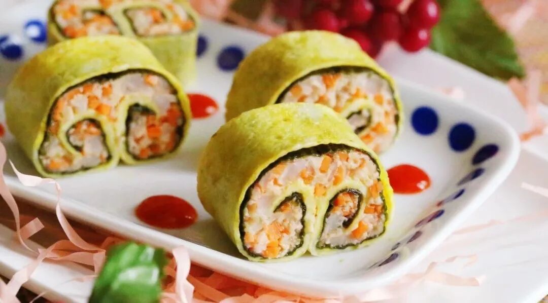 点评:红萝卜色泽鲜红,象征日子红红火火;虾与“祥”谐音,有祥瑞之意;双卷造型形似如意,并含有好事成双之意。