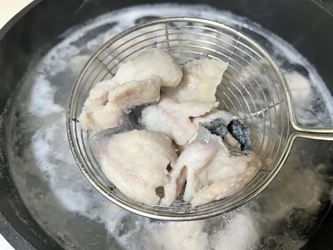 4.在锅中烧开水,把鱼片一片片放入锅中,先不要翻动,待变色后再用勺子轻轻翻动一下,捞出。