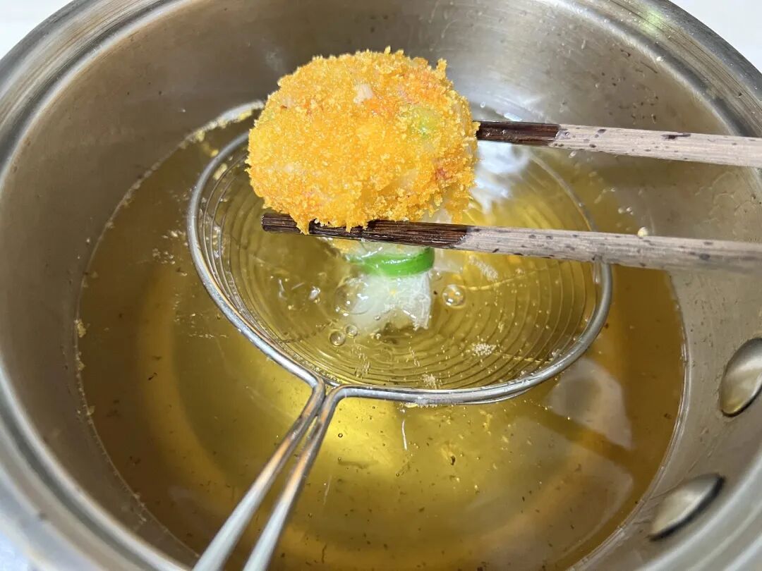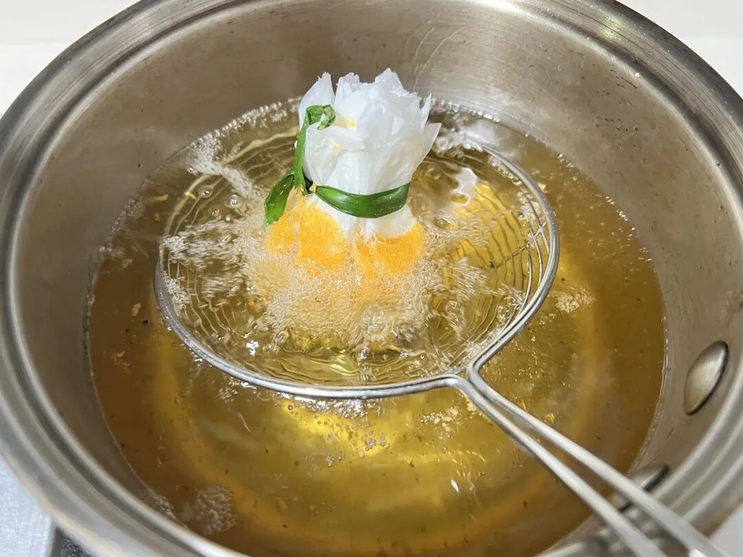 4.在小锅中放入400毫升食用油,加热至150℃,将福袋放在漏勺里,先将福袋底部放入油锅中炸至定型,然后将福袋上面的部分放入油中炸熟捞出,控油后盛出。