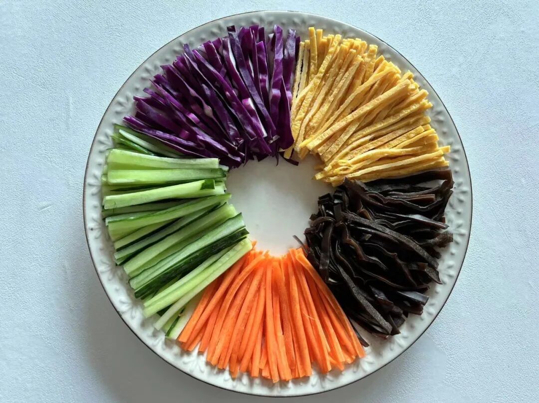 2.将黄瓜、紫甘蓝和胡萝卜清洗干净切丝,把泡发好的黑木耳放在开水里煮1分钟后捞起,冷却切丝。切好的各种蔬菜丝和蛋皮丝分类沿大盘摆放一圈。