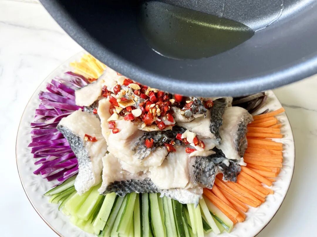 5.把煮好的鱼片放在大盘正中间,淋上味极鲜,放上蒜末和小红椒碎,将20毫升食用油烧热后淋在上面。