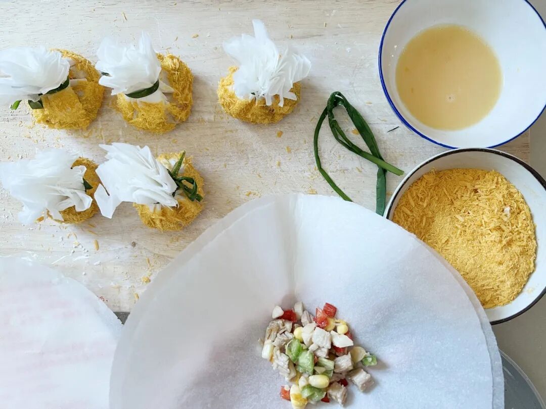 3.将3克玉米淀粉撒在案板上。将2张威化纸叠放在一起,舀一大勺馅料放在中间,将四边聚拢、捏紧、收口做成福袋形状,用烫过的韭菜叶扎住收口处,并用剪刀稍作修剪。将福袋底部先在蛋液里蘸一下,再放入盛金色面包糠的碗里蘸裹一下,然后放在案板上备用。依次完成所有福袋。