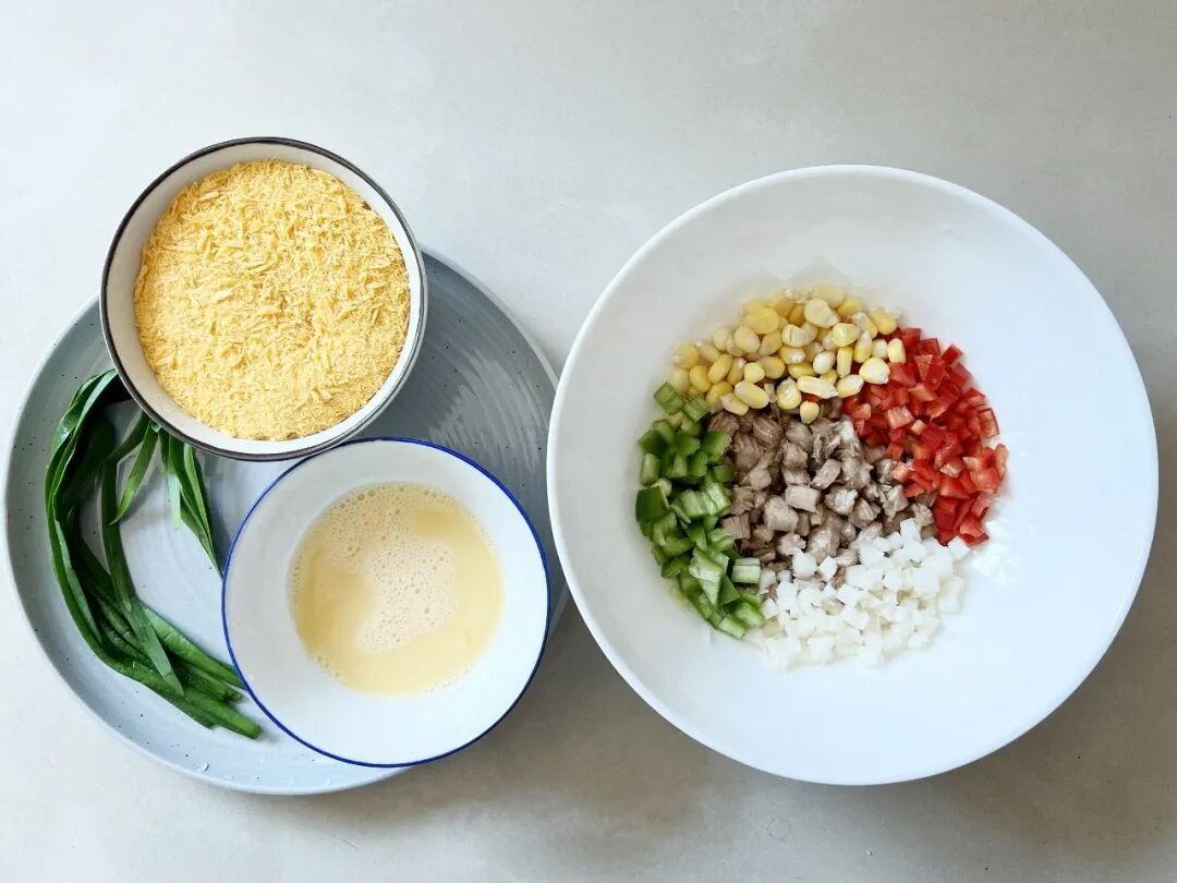 2.将去皮马蹄、青椒和红椒切成小丁放入碗中,加入腌制好的猪肉小丁、水果玉米粒拌匀做成馅料;另取一碗,放入金色面包糠;再取一碗,把鸡蛋敲入打成蛋液;将韭菜截取叶部,根部弃之不用,用开水烫一下韭菜叶,然后用凉水冲一下,沥干备用。