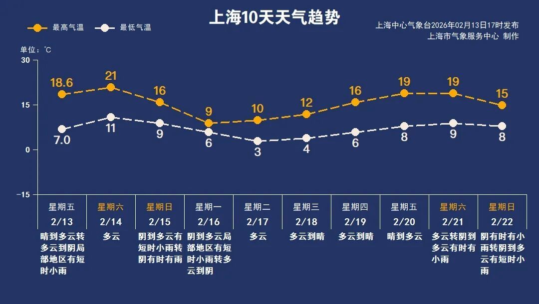 随着冷空气南下,15日白天上海云多雨弱,气温开始回落,夜间在冷暖空气交汇下,降雨趋于明显,过程雨量在小到中等。当天还可能伴有雨雾情况,路面湿滑,能见度下降,出行务必多加注意。16日(除夕)雨水渐止,全天气温降至6~9℃,加上风力较大,体感更冷。冬末时节乍暖还寒,记得及时添衣。