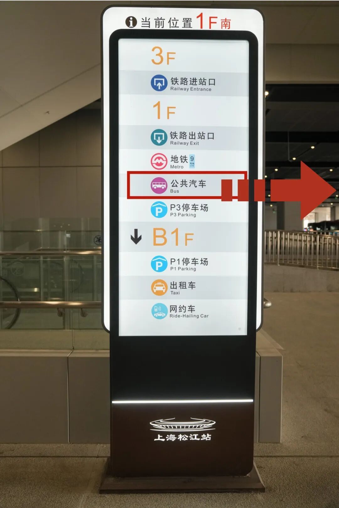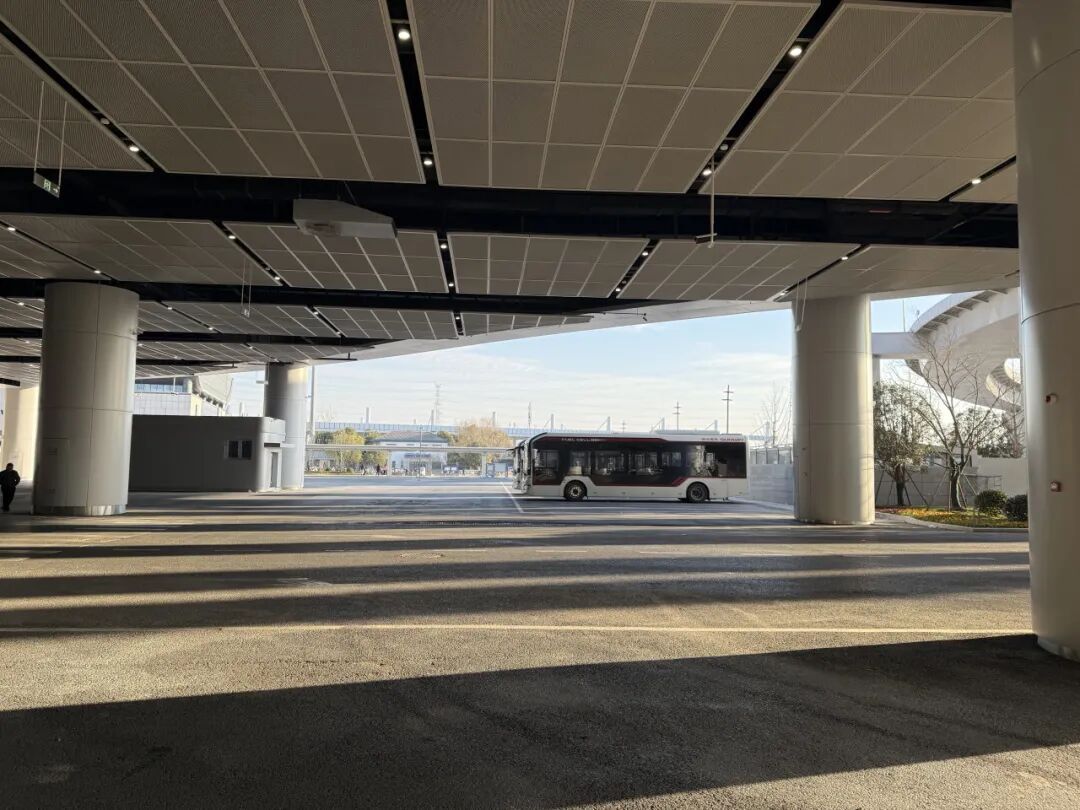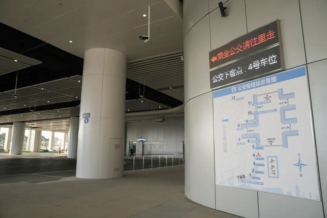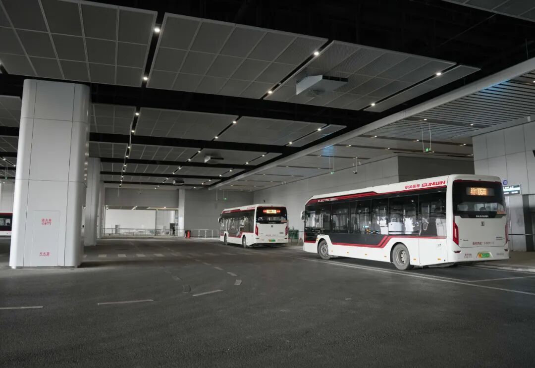 换乘公交的旅客从北区出站后,向右转,往前走,即可看到位于扶梯左侧的公交枢纽。