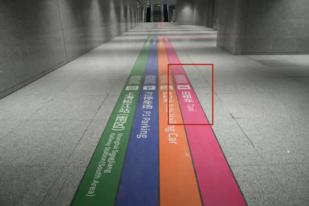 旅客从南区出站后,沿着地贴指示标识步行,即可看到地铁上海松江站站的出入口。