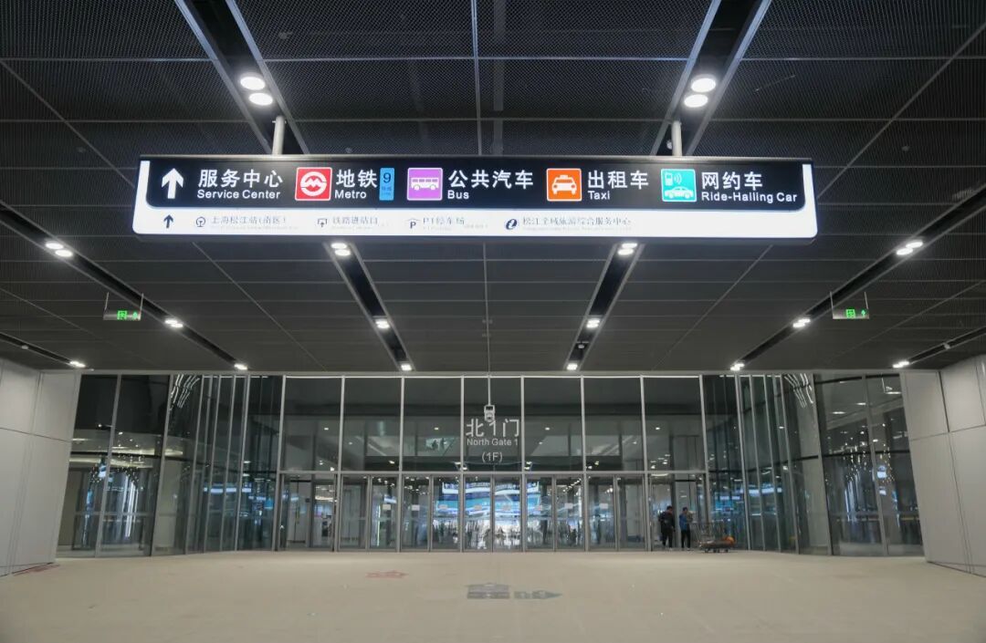 步入服务中心后,根据服务台屏幕上的标识向左转,往前从东1门走出服务中心,即可看到地铁上海松江站站的出入口。