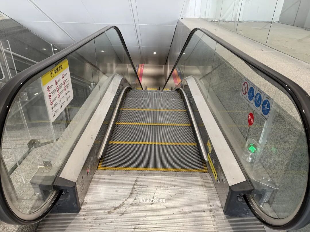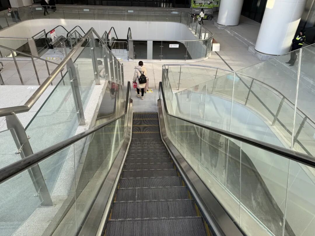 旅客从南区出站后,沿着地贴指示标识步行至扶梯口。