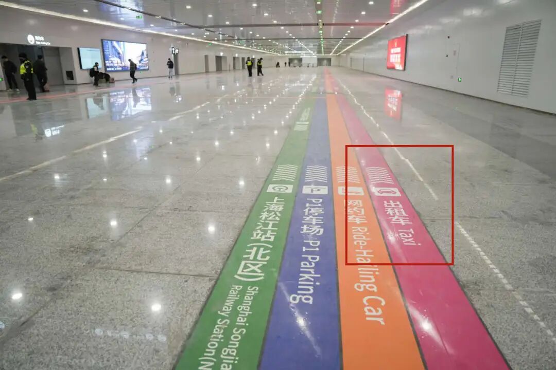 沿着地上醒目的标识步行至出租汽车上客点。