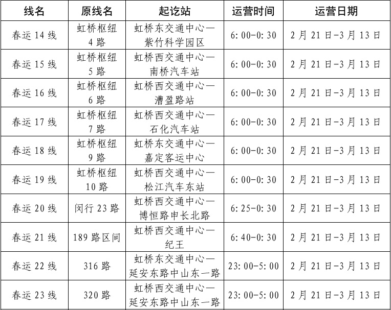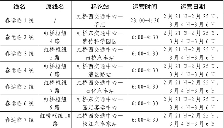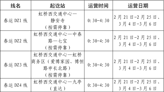 春运返程高峰期间,在2月21日至2月25日(初五至初九)、3月4日至3月6日期间,将开通4条春运定制公交线路,由虹桥枢纽开往虹桥商务区、静安寺、七宝、九亭等四个方向,运营时间从00:30至04:30。
