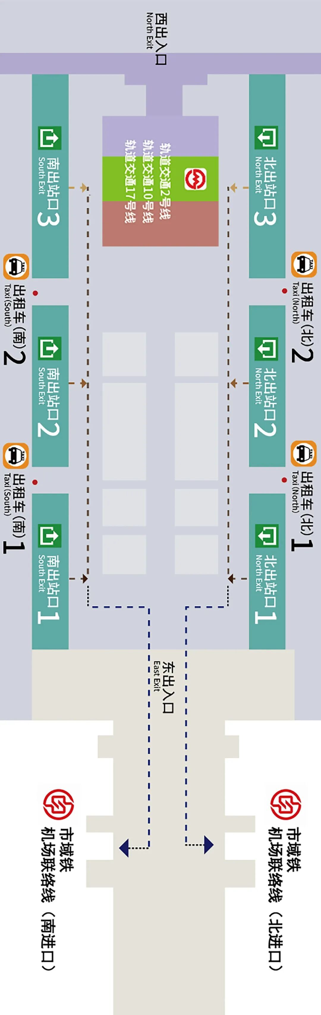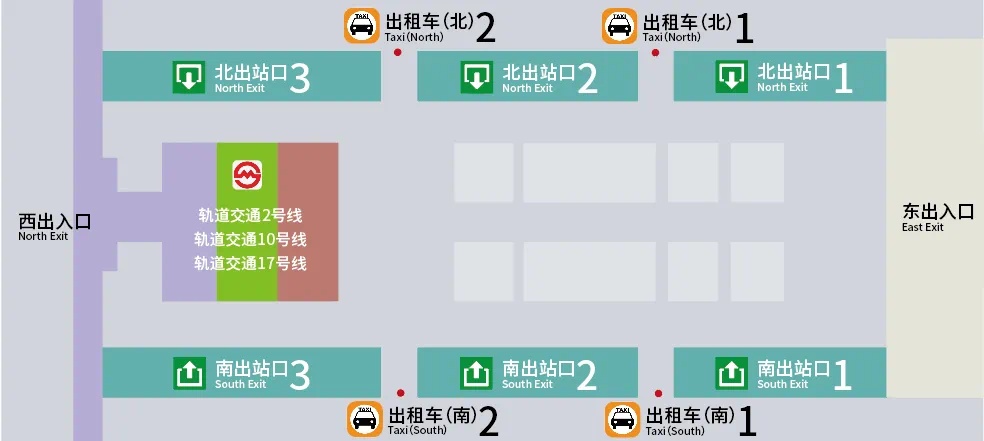 从南出站口2、北出站口2出来的旅客,可选择在出租车南1、出租车南2、出租车北1、出租车北2乘坐出租车;
