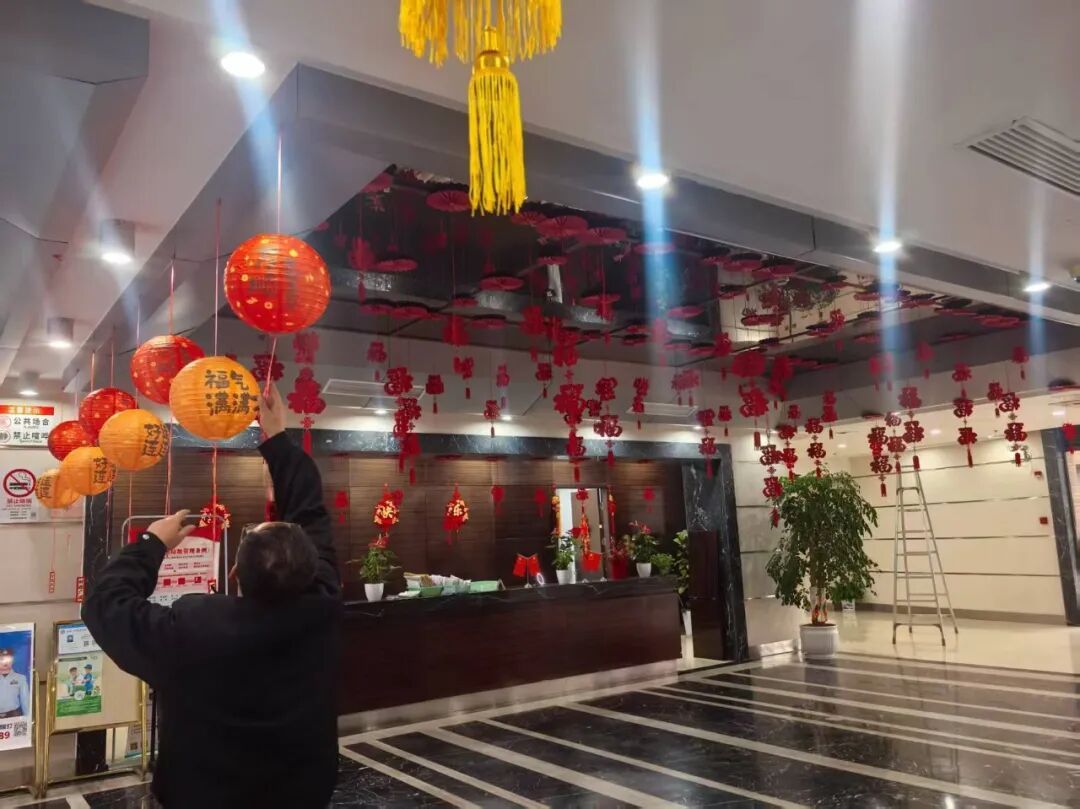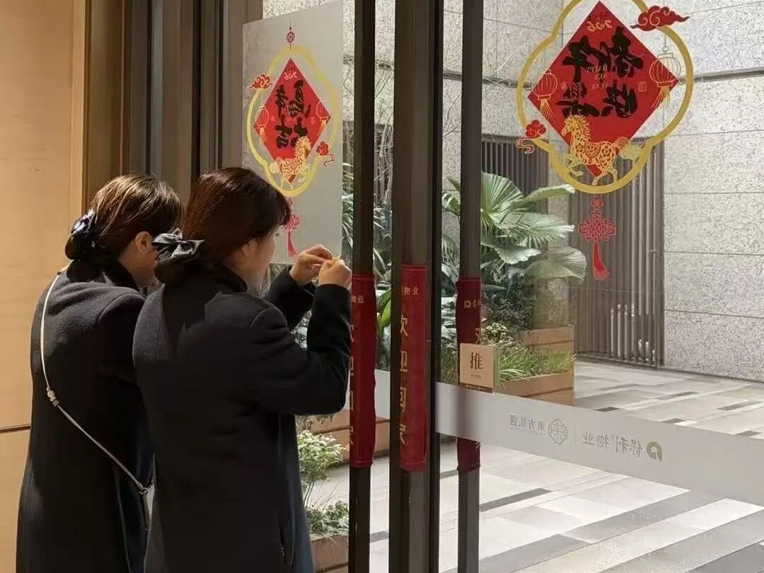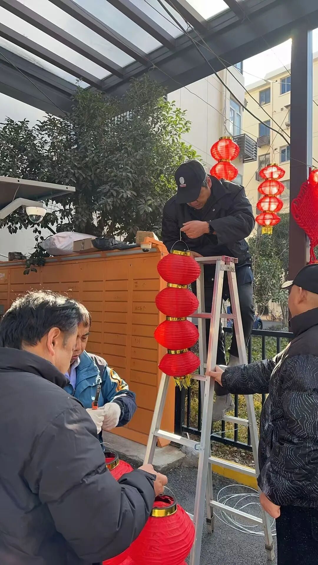 在物业服务中心、小区主出入口、单元大厅及主干道等重点区域,精心张贴新春门贴、悬挂红灯笼、点亮璀璨彩灯,并巧妙融入春联、“福”字等传统年俗元素,将中华年文化的雅致韵味与现代社区的整洁美感有机融合。一盏灯、一副联、一抹中国红,不仅点亮了归家之路,更传递出浓浓的年味与邻里温情,营造出“温馨、祥和、喜庆”的新春氛围。