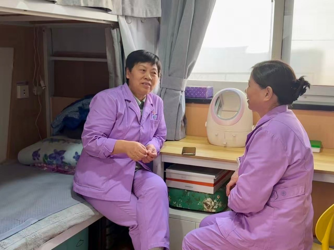 董红梅正在房间里和同事聊天,两人商量着春节去哪儿聚餐。董红梅来自山西,从事养老行业已经八年多,是一名高级护理员。住进新家近一周,她对这里的环境十分满意:“房间南北通透,晒得到太阳。从养老院出来回到这个小家,能够休息得更好。”记者看到,房间内为上下铺形式,均装有隐私帘,卫生间、淋浴、无线网络等一应俱全。在西侧另一楼栋的一楼,配备了宽敞明亮的公共厨房、用餐区与会客区,满足了她们做饭、休闲、社交等需求。保洁人员定期入户清洁,让护理员们能真正在下班后得到放松。此外还设有管家服务、24小时便利超市,从细节处打造了便捷、温馨的居住环境。