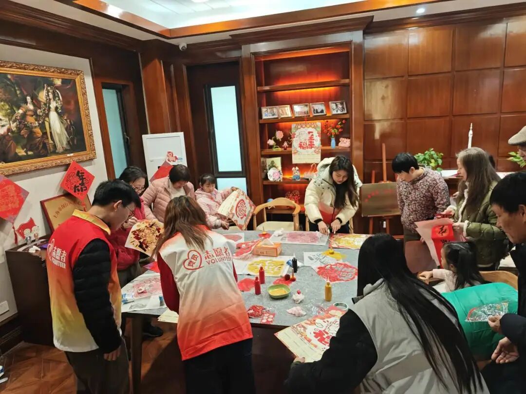 还有居民围坐在一起制作福字拓印挂件,固定底板、铺纸按压,再经过裁剪、装饰与串挂,一个个精巧的福字挂件在指尖逐渐成形,承载着对新年的美好祝愿与吉祥期盼。
