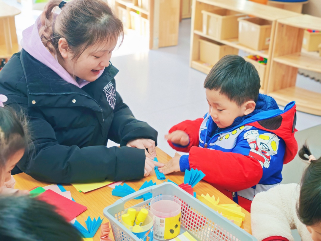 为了让孩子们在寒假班提前感受浓浓的年味儿,老师带领孩子们用彩色手工纸,通过折、叠、粘等步骤,一步步制作出色彩缤纷、造型别致的新年灯笼。孩子们专注的眼神、灵巧的小手,在欢声笑语中体验着传统手工的乐趣。
