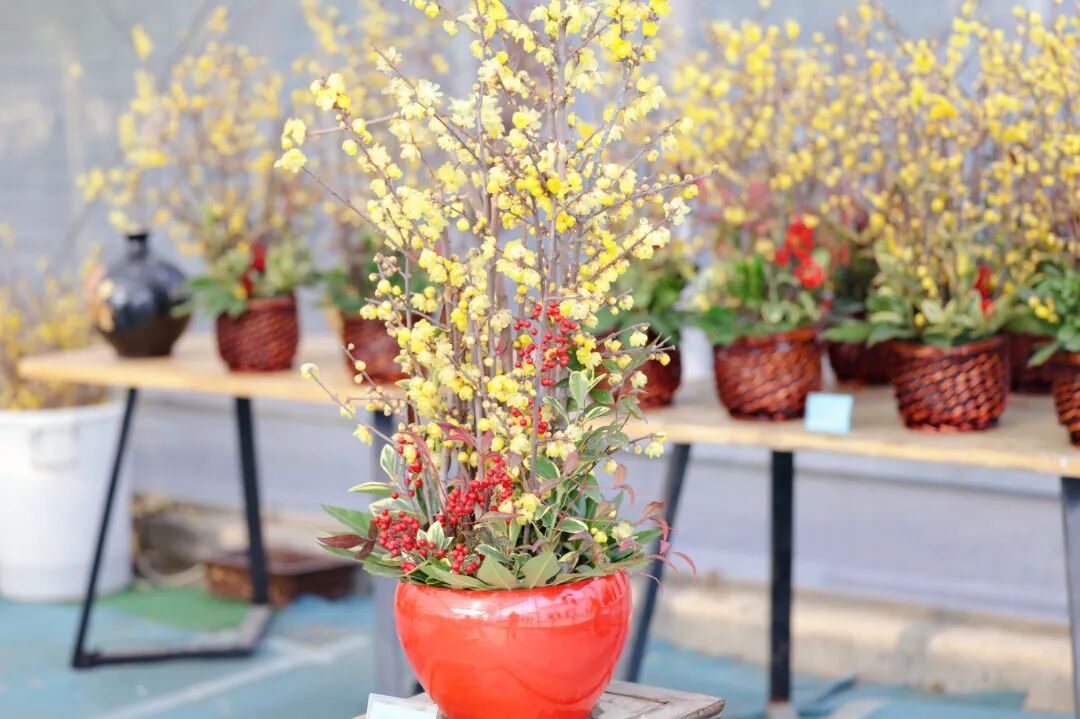 蜡梅园旁的蜡梅盆景与鲜切花销售处吸引了不少市民驻足挑选,黄灿灿的蜡梅配上红艳的南天竹果,显得格外喜庆。临走时,还可将这一缕幽香带回家中,增添年味。