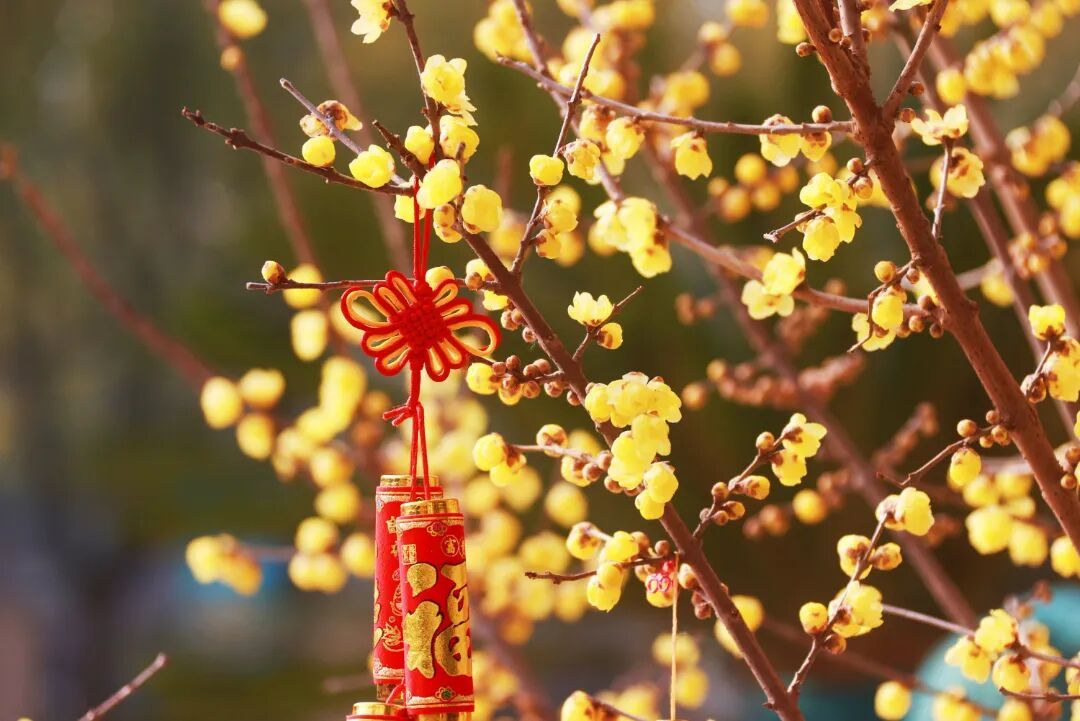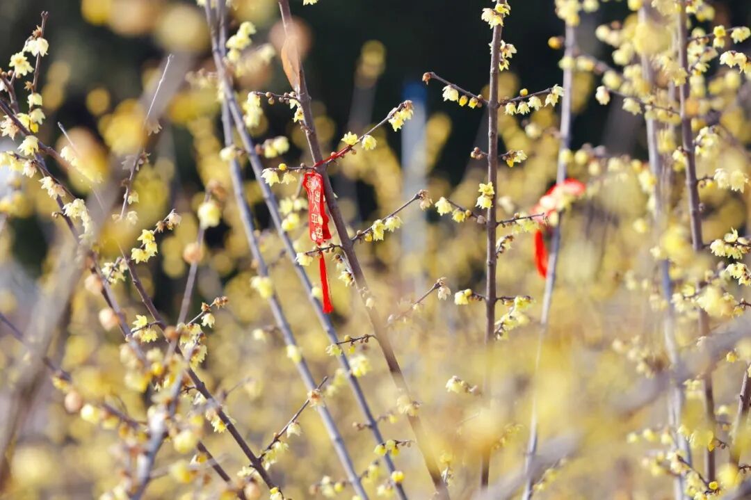 园内小径蜿蜒,梅枝苍劲,更有部分枝条上点缀着玲珑的红色吉祥挂饰与手写祝语的迷你春牌,金蕊映红,新年喜气悄然缀满枝头。满目金梅与游人衣衫的那一抹亮色相映,交织出充满温度的新春画面。