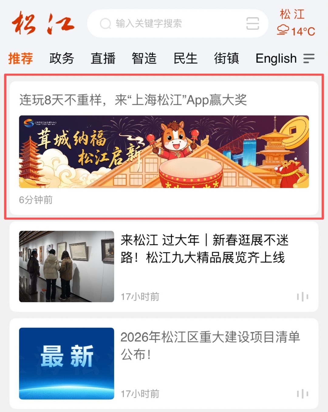 1.打开“上海松江”客户端,在首页找到活动通道入口。