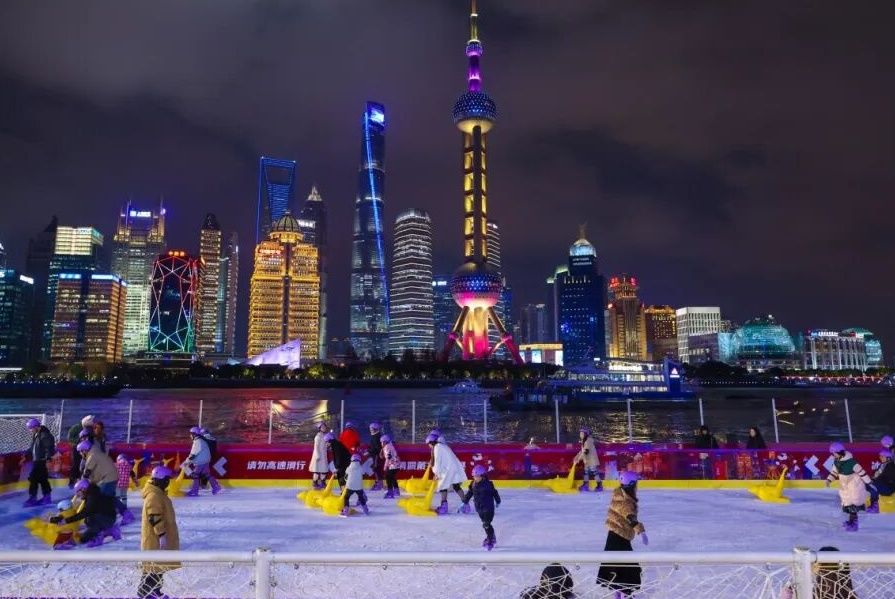 冰场上,冰刀划过冰面的清脆声响、孩童的欢笑声、游客的谈笑声交织在一起,身着各色新春服饰的市民游客畅快滑行,抬头便能望见魔都“三件套”,这份“在城市天际线下滑冰”的体验,让冰雪运动与滨江美景完美碰撞。