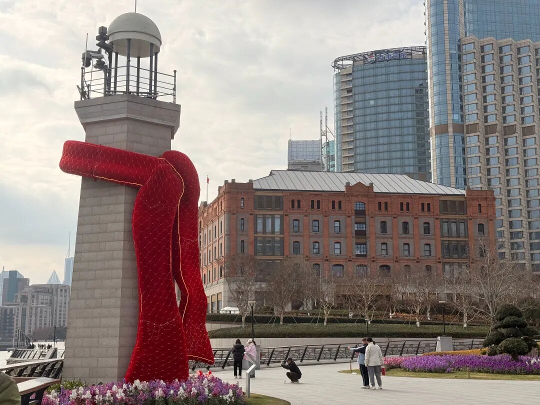 地标海事塔披上了冬日限定红围巾,与冰场适配度满分