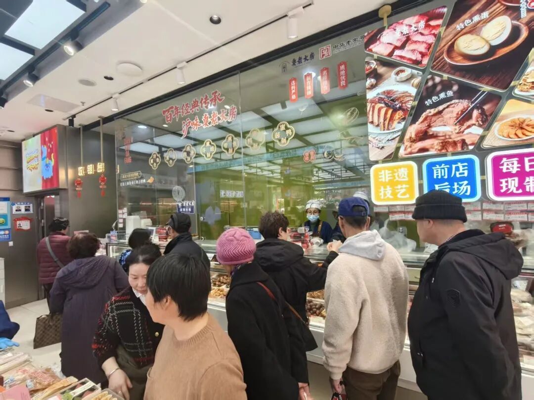 拥有175 年历史的中华老字号真老大房,同样迎来年货销售高峰。店内人头攒动,非遗技艺制作的熏鱼、熏蛋前挤满顾客,坚持现制现售,保留本帮醇厚鲜香,不少市民专程赶来,把这份老上海味道搬上年夜饭餐桌。