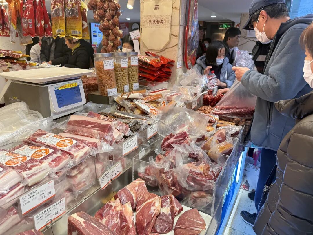 上午九点半,泰康食品刚开门半小时,一楼腌腊柜台前已排起长龙,队伍蜿蜒至店外。整只火腿、成串香肠、酱鸭风鹅挂满铁架,枣红油亮、咸香扑鼻,营业员一刻不停地称重、打包、补货,成为店里当之无愧的 “人气王”。