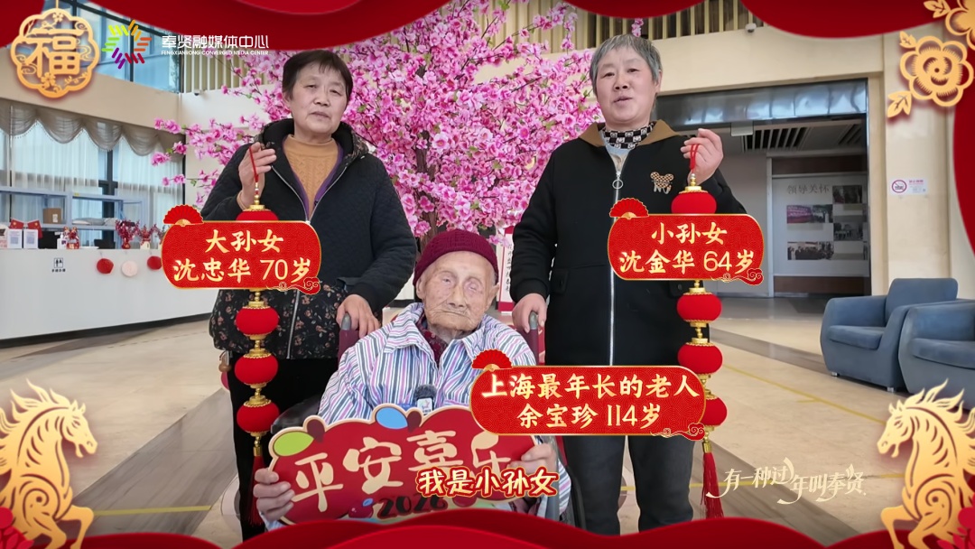 席近尾声,大屏幕亮了——上海最年长的老人端坐镜头前,银发梳得齐整:“我给大伙儿拜年,吃好喝好,年年岁岁,咱们还要一起过年。”