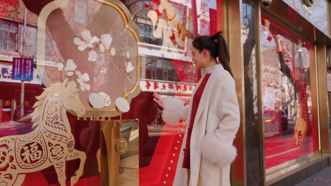 马年新春,淮海路被喜庆裹挟,巨型红马矗立,与繁花相映,氛围感拉满。循着年味前行,一场“穿红戴金·一路生喜”的焕新之旅悄然开启,奇美、古今、天宝龙凤、徐重道等老字号“各显神通”,用烟火暖意解锁马年新福运。