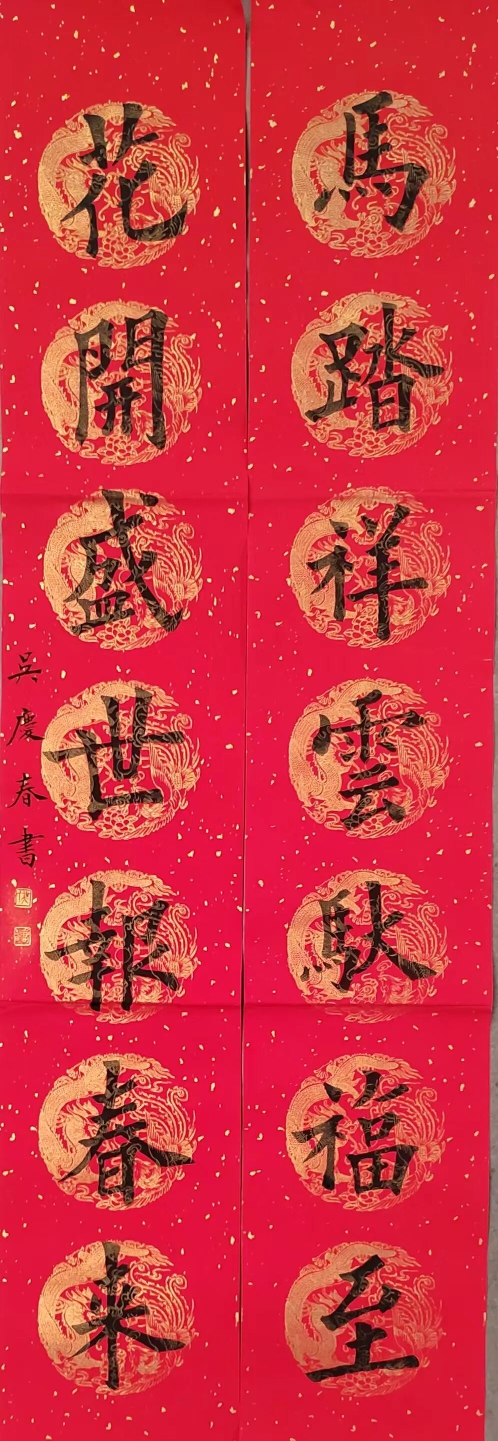吴庆春/书法对联《马踏祥云驮福至 花开盛世报春来》
