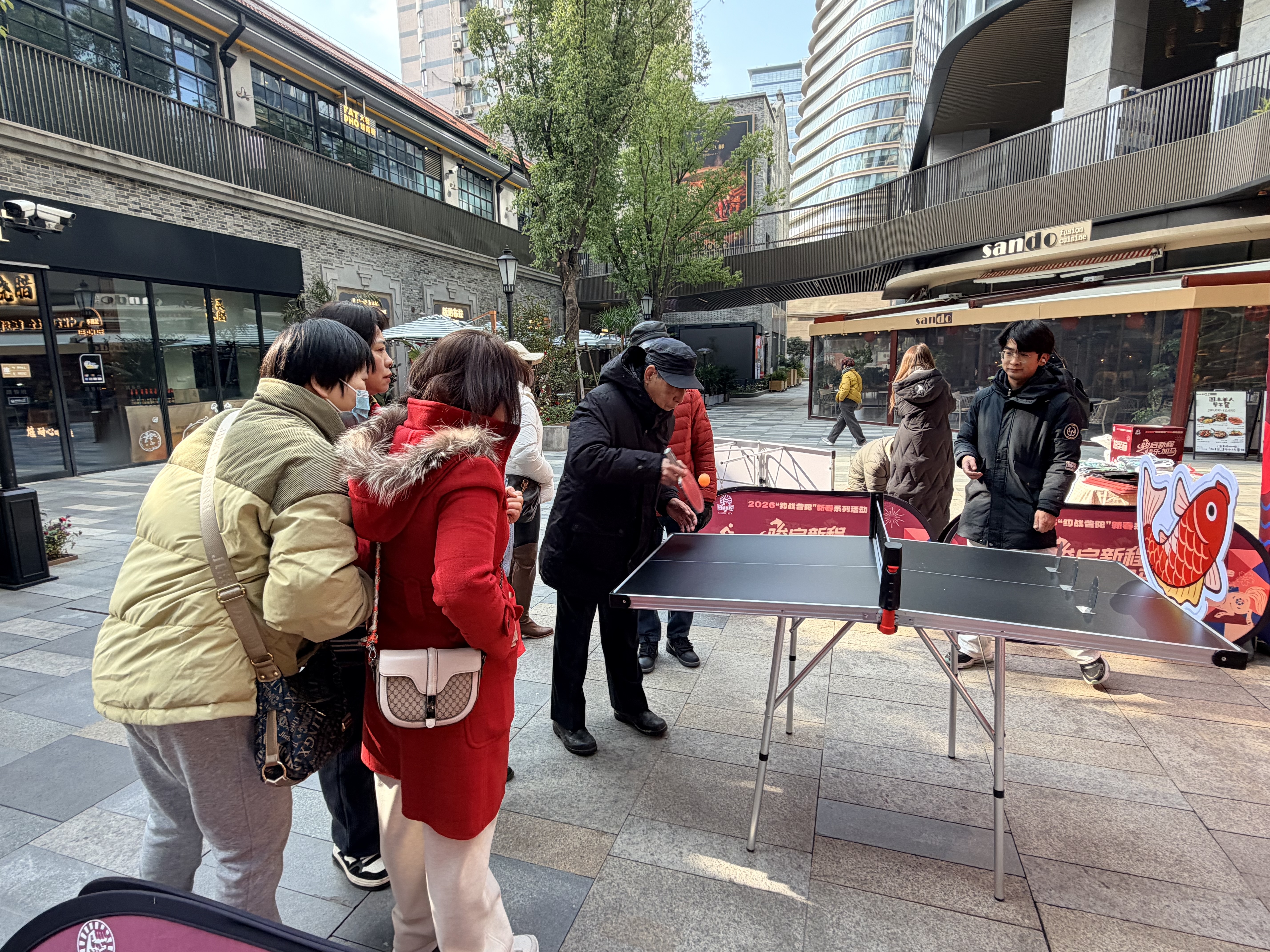 走进鸿寿坊,酒红色飘带与铜钱装饰点缀门头,红墙上彩绘骏马跃然眼前,二层连廊下国风灯笼与鱼灯交相辉映,处处透着喜庆。而最热闹的当属广场中央临时搭建的乒乓球台——选手们挥拍激战,围观人群不时爆发出喝彩声。赛事以“爱乒才会赢”为主题,紧扣马年“奋进向上”的寓意,邀请乒乓球爱好者以球会友,在运动中开启新春序曲。
