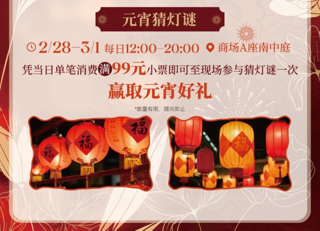 凭当日单笔消费满99元小票 即可参与猜灯谜活动一次 用你的智慧赢取元宵好礼 “马上如愿” 系列活动 精彩不停
