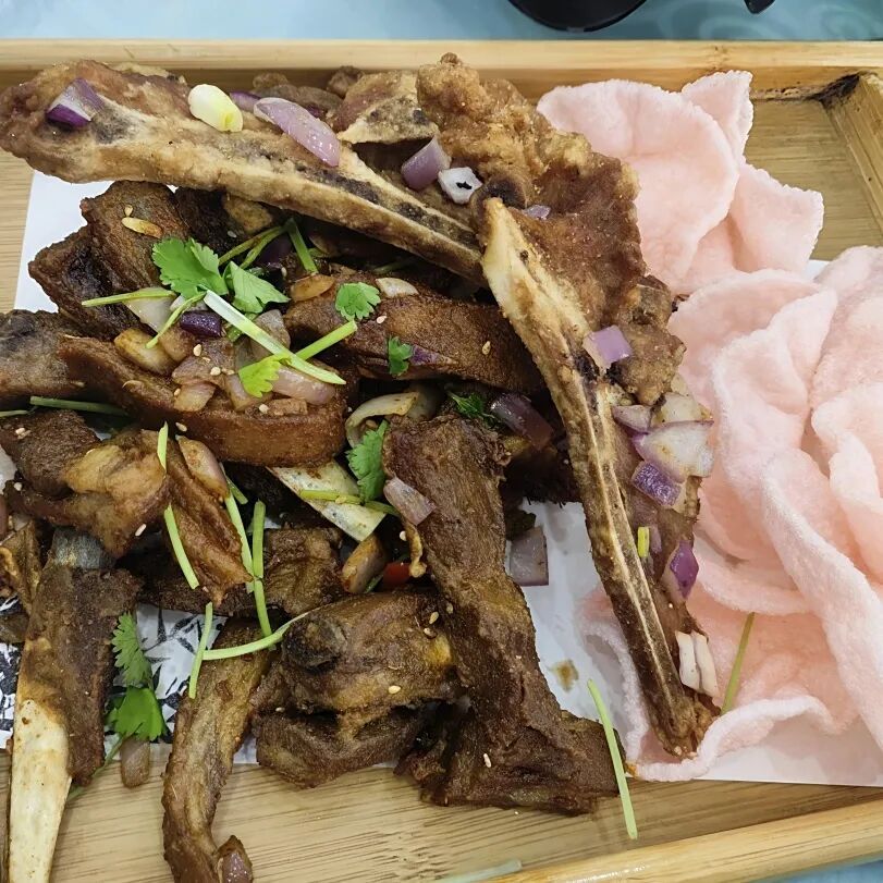 羊排外焦里嫩,香酥入味,搭配虾片,嘎嘣脆,配羊排刚好。