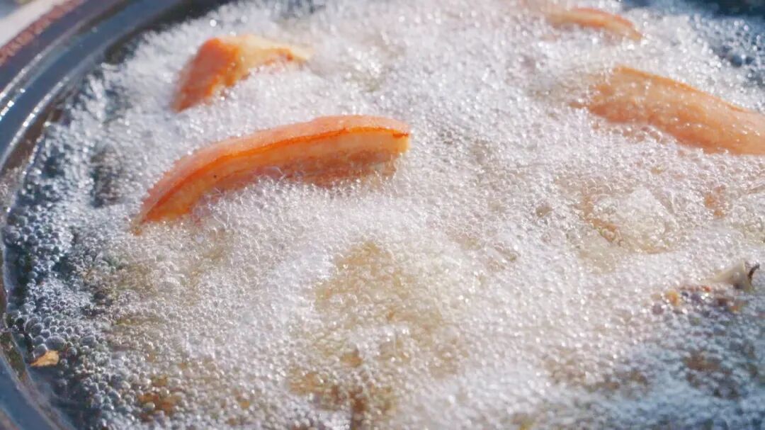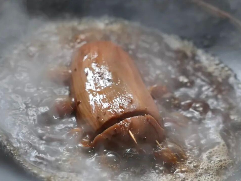 泡透的肉切成厚片,接下来就可以红烧。土灶里的火调得温温吞吞,大铁锅盖上木盖,肉就在这文火慢煨中渐渐蜕变。蒸汽贴着锅边袅袅升起,带着酱油、糖与香料交融的醇厚香气。